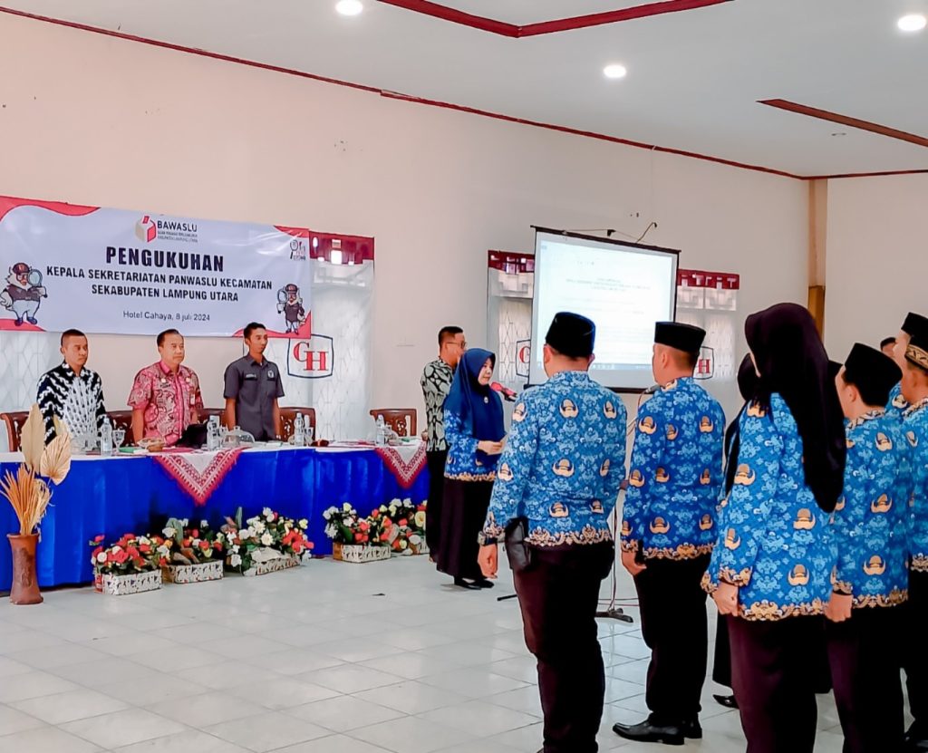 Sebanyak 23 Koordinator Sekertariat Panitia Pengawas Pemilihan Umum (Panwaslu) Kecamatan se-Kabupaten Lampung Utara resmi dilantik pada Senin, (8/7). Pelantikan ini dihadiri oleh Kepala Sekretariat Bawaslu Provinsi Lampung Widodo Wuryanto, Koordinator Divisi SDMO Bawaslu Lampung Utara Angga Santoso, Kordinator Sekretariat Bawaslu Lampung Utara Mulia Dewi.
