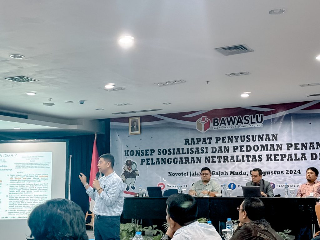 Dalam rangka mengefektifkan pengawasan serta penanganan pelanggaran terhadap netralitas kepala desa pada Pemilihan Gubernur, Bupati, dan Walikota Tahun 2024 Bawaslu mengadakan menyelenggarakan Rapat Penyusunan Konsep Sosialisasi dan Pedoman Penanganan Pelanggaran Netralitas Kepala Desa, Dijakarta, Kamis (1/8). Dalam kesempatan tersebut turut hadir Koordinator Divisi Penanganan Pelanggaran Bawalu Provinsi Lampung Tamri beserta Koordinator Divisi Penanganan Pelanggaran Bawaslu Provinsi/Panwaslih Aceh Seluruh Indonesia