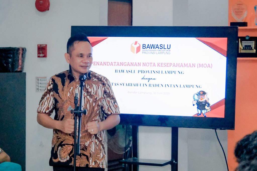 Bawaslu Provinsi Lampung resmi menandatangani nota kesepahaman dengan Fakultas Syariah Universitas Islam Negeri Raden Intan Lampung. Penandatanganan kerja sama yang dilangsungkan di Kantor Bawaslu Provinsi Lampung, Kamis (12/06). Penandatangan ini menjadi tonggak penting dalam penguatan kolaborasi antar lembaga untuk mendukung tridharma perguruan tinggi, pengembangan sumber daya manusia, serta penguatan pengawasan partisipatif dalam Pemilu dan Pilkada.