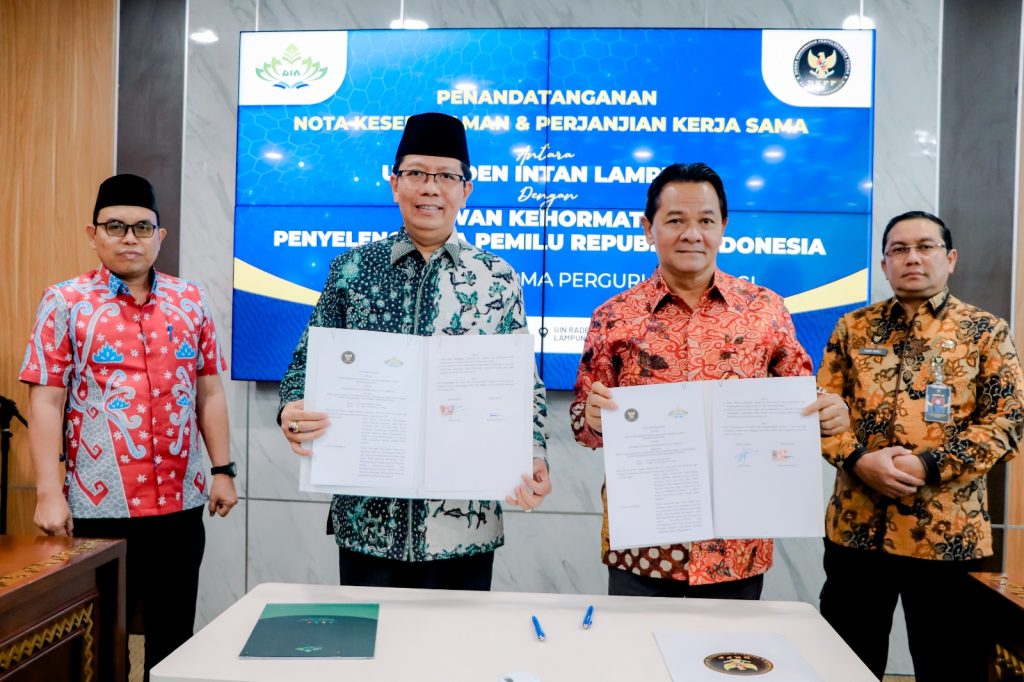 Bawaslu Provinsi Lampung menghadiri Kegiatan Penandatangan Nota Kesepahaman Antara Dewan Kehormatan Penyelenggara Pemilihan Umum Republik Indonesia dengan Universitas Islam Negeri Raden Intan Lampung Tentang Kerja Sama Penguatan Demokrasi Dan Integritas Pemilu Di Indonesia Serta Pelaksanaan Tri Dharma Perguruan Tinggi di Uin Raden Intan Lampung. Kamis, 11 Mei 2023.