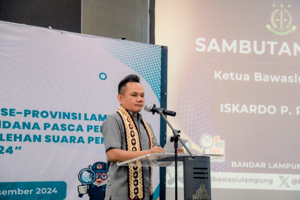 Dalam sambutannya, Ketua Bawaslu Provinsi Lampung, Iskardo P. Panggar, menyampaikan apresiasi atas kerja keras dan kolaborasi antara Bawaslu, Kepolisian, dan Kejaksaan yang selama ini telah berhasil menjaga stabilitas proses pemilu serentak.