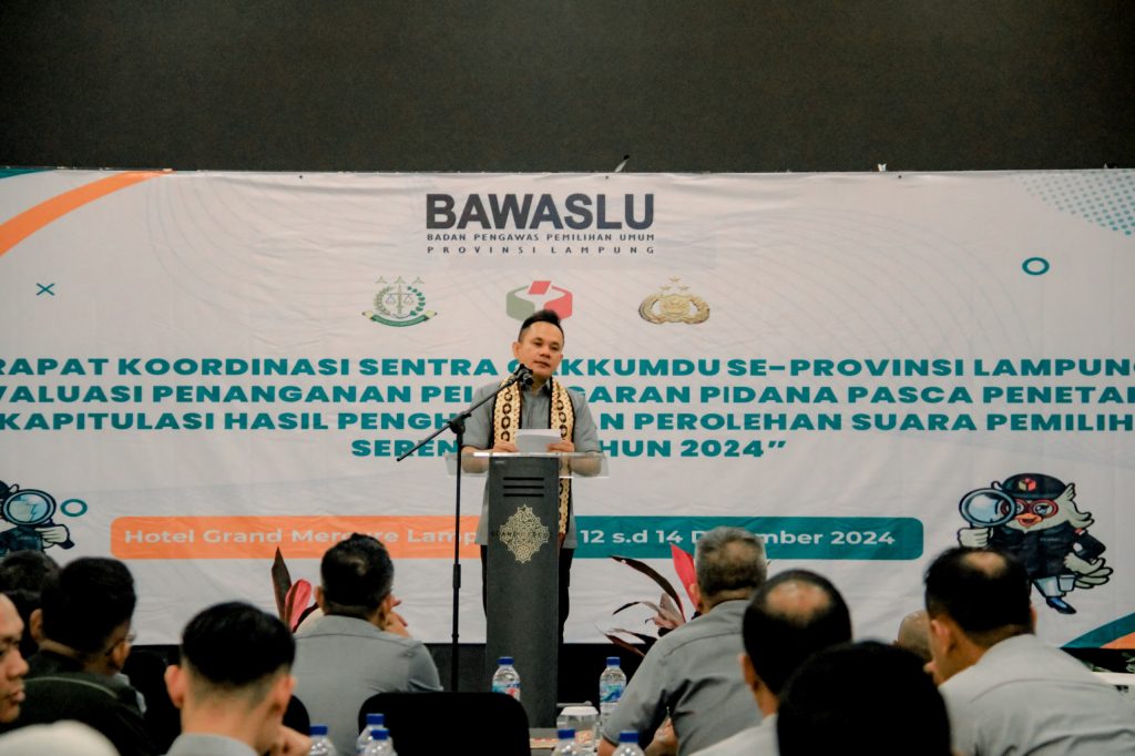 Badan Pengawas Pemilihan Umum (Bawaslu) Provinsi Lampung menggelar Rapat Koordinasi Sentra Penegakan Hukum Terpadu (Gakkumdu) se-Provinsi Lampung dengan bertema “Evaluasi Penanganan Pelanggaran Pidana Pasca Penetapan Rekapitulasi Hasil Pemilu Serentak Tahun 2024†ini diadakan di Bandar Lampung, Jumat (13/12).