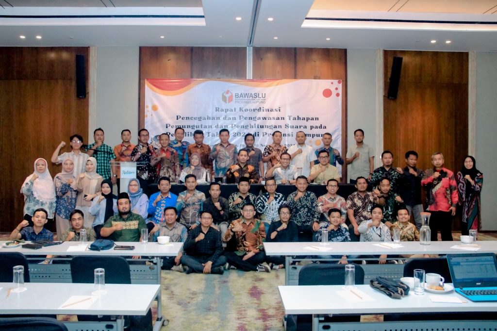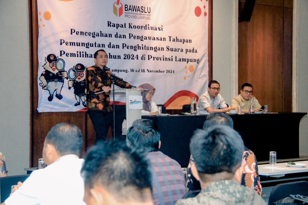 Badan Pengawas Pemilu (Bawaslu) Provinsi Lampung menggelar Rapat Koordinasi (Rakor) Pengawasan Tahapan Pemungutan, Penghitungan Suara, dan Rekapitulasi Hasil Perolehan Suara pada Pemilihan Gubernur, Bupati, dan Wali Kota Tahun 2024, Minggu (17/11).