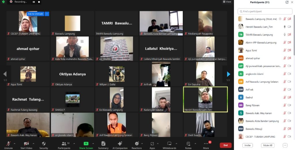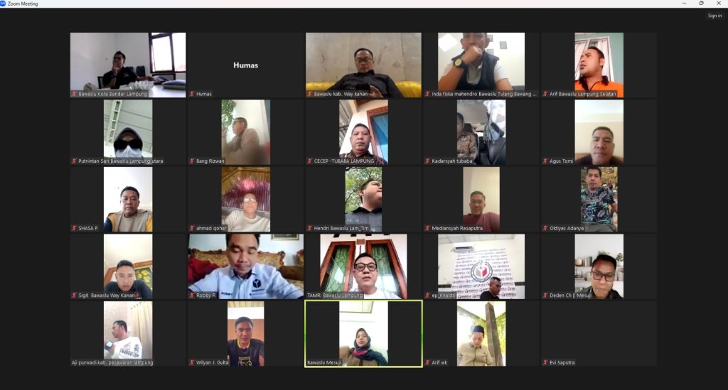 Bawaslu Provinsi Lampung mengadakan Rapat Koordinasi Pelaksanaan Pengawasan dan Penanganan Pelanggaran Tahapan Kampanye Pemilihan Serentak 2024 secara daring pada Sabtu (19/10).