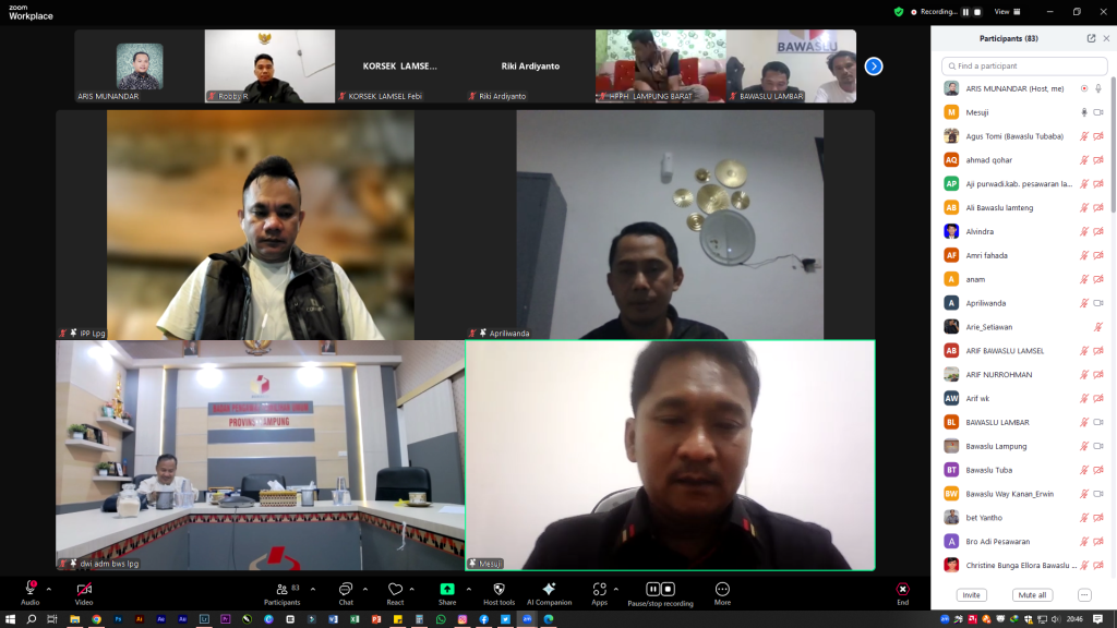 Menjelang pelaksanaan Pilkada Serentak 2024, Bawaslu Provinsi Lampung menggelar rapat koordinasi virtual melalui Zoom untuk memastikan kesiapan pengawasan pada tahap pemungutan dan penghitungan suara. Rapat ini dipimpin oleh Ketua Bawaslu Provinsi Lampung, Iskardo P. Panggar, dan diikuti oleh seluruh jajaran Bawaslu kabupaten/kota se-Provinsi Lampung, Selasa (26/11).