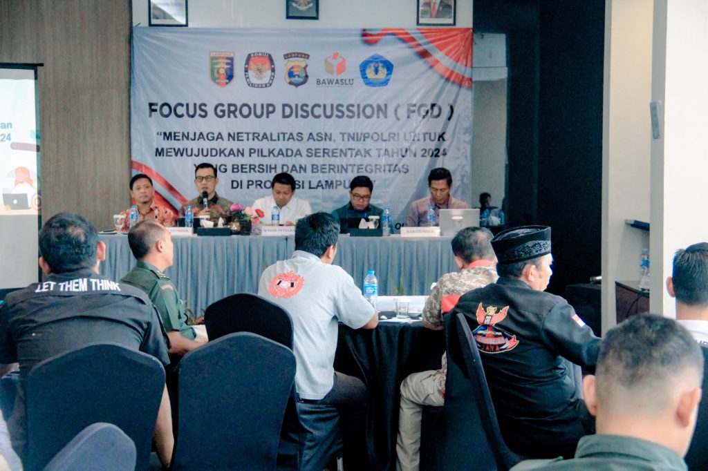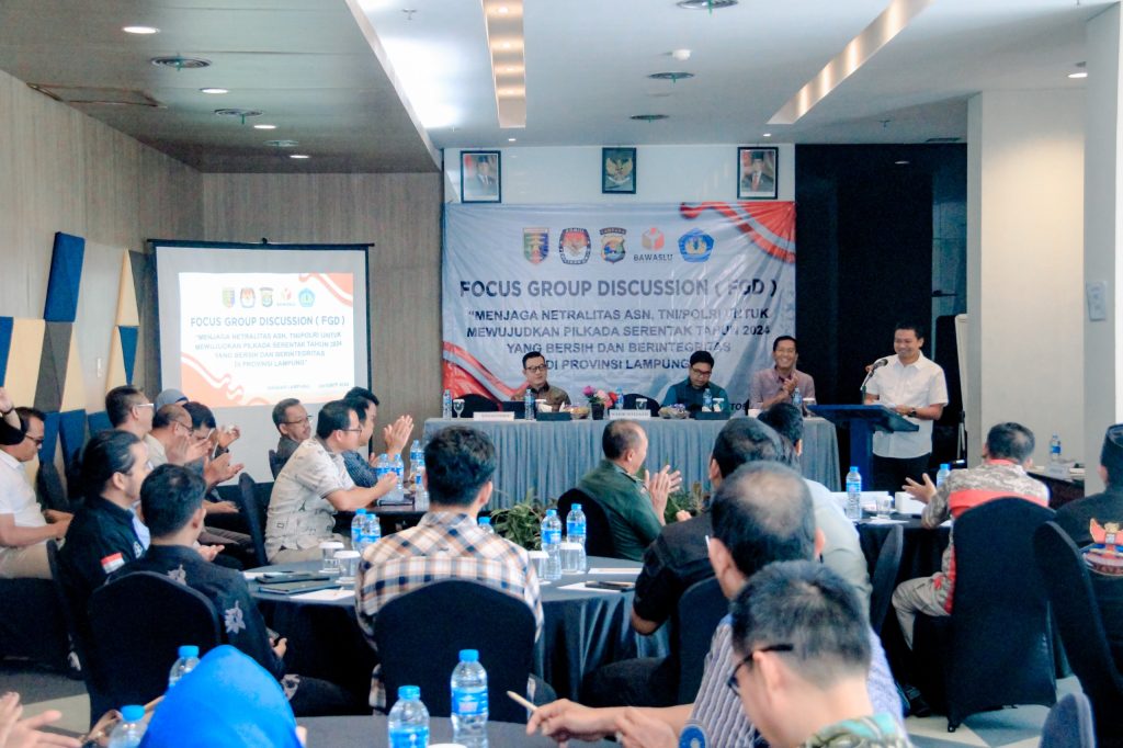 Dalam rangka mewujudkan Pilkada Serentak Tahun 2024 yang bersih dan berintegritas, Polda Lampung menyelenggarakan Focus Group Discussion (FGD) bertajuk "Menjaga Netralitas ASN, TNI/POLRI untuk Mewujudkan Pilkada Serentak 2024 yang Bersih dan Berintegritas" di Bandar Lampung, Kamis (24/10). Acara ini digelar oleh Polda Lampung, dan dihadiri oleh Ketua KPU Lampung, Erwan Bustami, Anggota Bawaslu Lampung, Tamri, perwakilan Badan Kepegawaian Daerah (BKD) Provinsi Lampung, serta sejumlah pengamat politik dari Universitas Lampung (Unila).