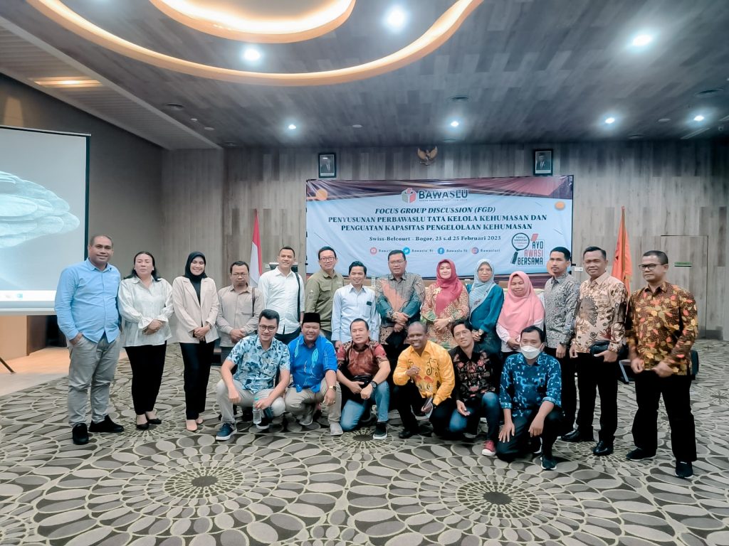 Anggota Bawaslu Lampung Karno A. Satarya dan M. Teguh menghadiri Focus Group Discussion Penyusunan Perbawaslu Tata Kelola Kehumasan dan Penguatan Kapasitas Pengelolaan Kehumasan yang dilaksanakan di Swiss - Belcourt, Bogor, Kamis (23/2/2023).