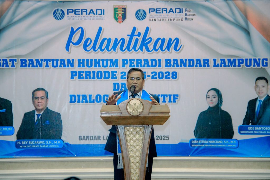 Dalam acara pelantikan tersebut, Ketua DPC PERADI Bandar Lampung, H. Bey Sujarwo, menjelaskan bahwa PBH PERADI merupakan satu-satunya lembaga bantuan hukum advokat di Lampung yang memiliki perangkat lengkap, termasuk komisi pengawas. Ia menegaskan bahwa bantuan hukum adalah tanggung jawab sosial yang telah diatur dalam Undang-Undang Nomor 18 Tahun 2003 tentang Advokat.