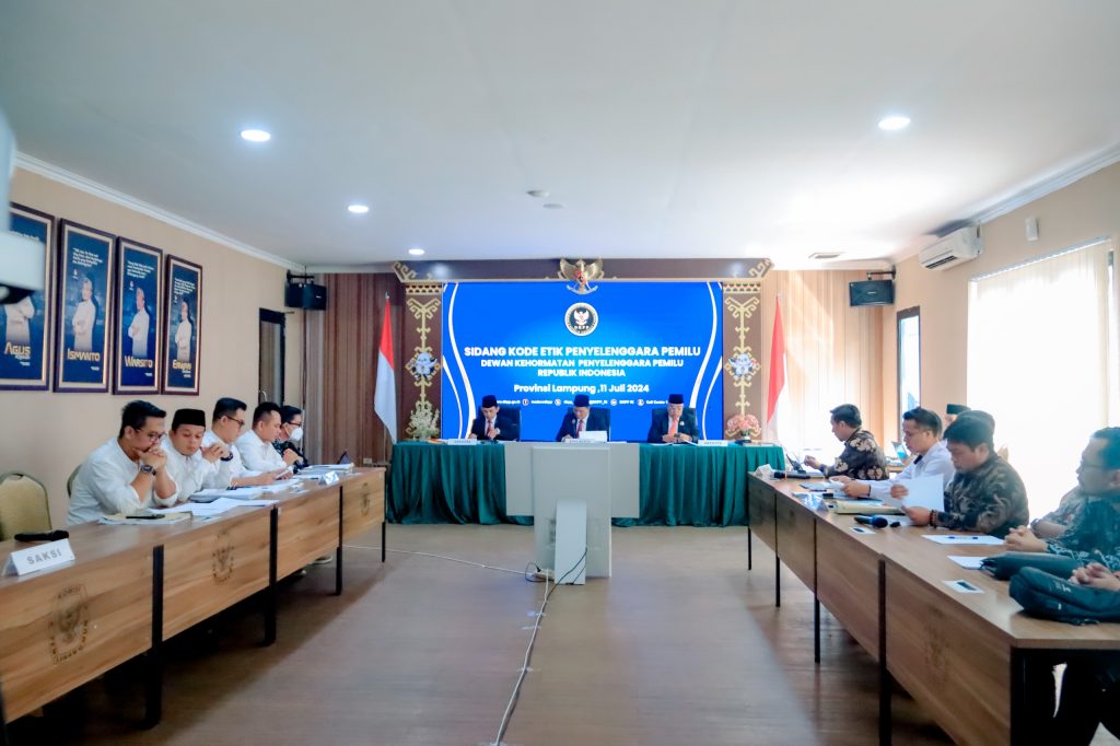 Bawaslu Provinsi Lampung menghadiri sidang dugaan pelanggaran kode etik penyelenggara pemilu oleh Dewan Kehormatan Penyelenggara Pemilu (DKPP) dalam agenda mendengarkan pokok pengaduan dari pengadu, jawaban teradu dan mendengarkan keterangan saksi di Ruang Sidang KPU Provinsi Lampung. Dalam hal tersebut Bawaslu Provinsi Lampung sebagai pihak pengadu, Kamis (11/07).