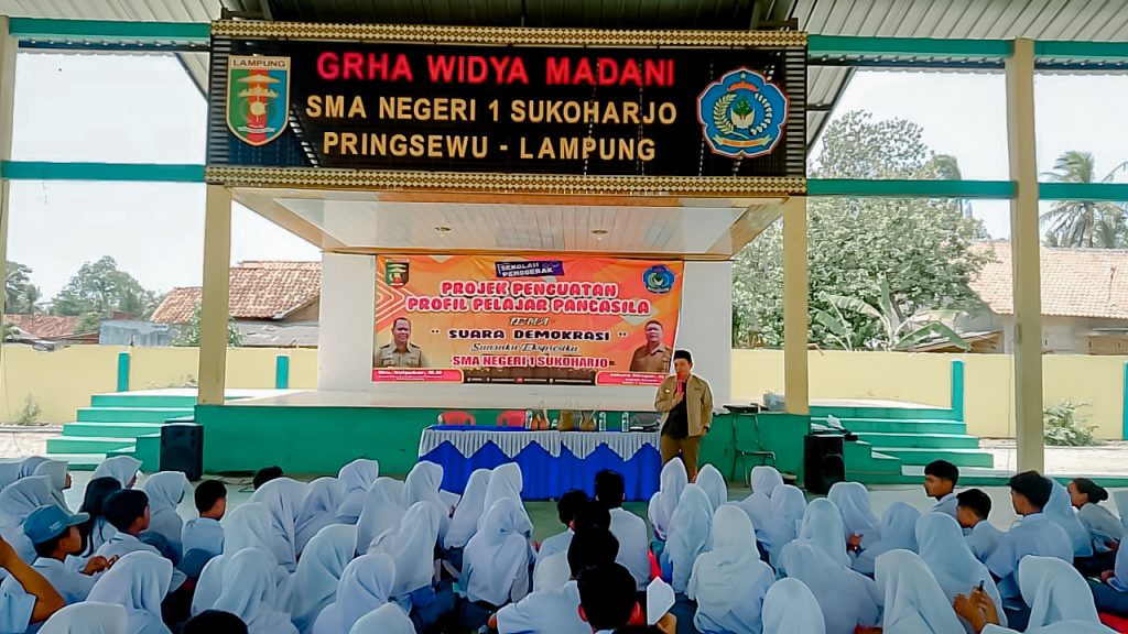 Anggota Bawaslu Provinsi Lampung, Imam Bukhori menjadi narasumber pada acara Projek Penguatan Profil Pelajar Pancasila dengan tema "Suara Demokrasi: Diskusi Kritis Pentingnya Berkontribusi dalam Pemilihan Umum" yang berlangsung di Aula SMA Negeri 1 Sukoharjo, Kecamatan Sukoharjo, Kabupaten Pringsewu, pada Selasa, (27/08).