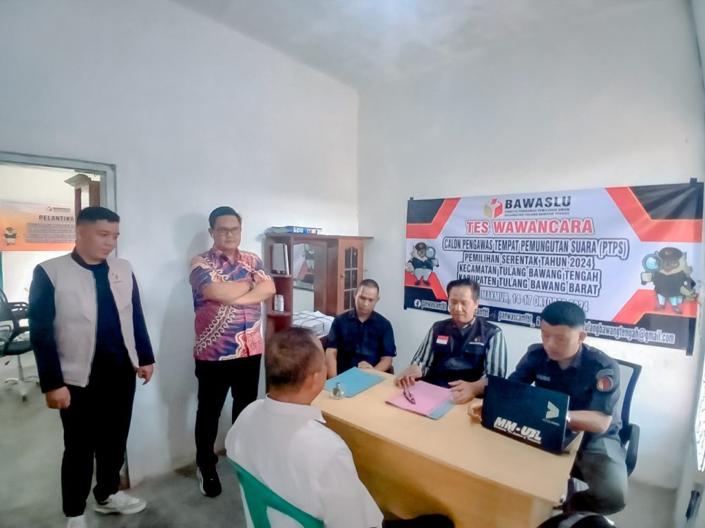 Anggota Bawaslu Provinsi Lampung, Suheri, melaksanakan supervisi dan monitoring terhadap tahapan tes wawancara rekrutmen calon anggota Pengawas Tempat Pemungutan Suara (PTPS) yang berlangsung di wilayah Bawaslu Kabupaten Tulang Bawang. Kegiatan ini menjadi bagian penting dalam memastikan kualitas dan integritas calon anggota PTPS yang akan bertugas pada Pemilihan Umum Kepala Daerah (Pilkada) 2024.