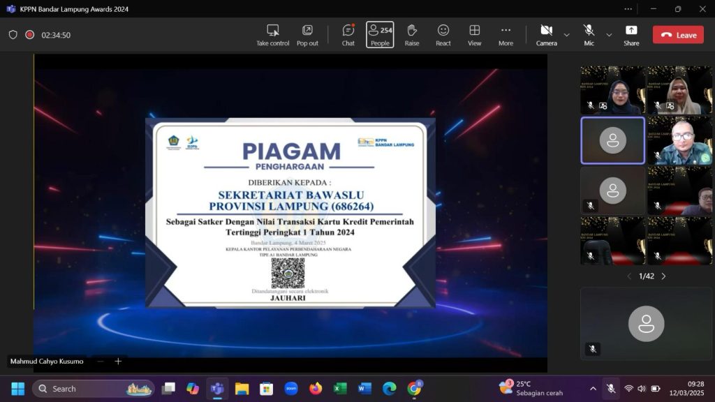 Badan Pengawas Pemilihan Umum (Bawaslu) Provinsi Lampung raih kembali penghargaan sebagai Satuan Kerja (Satker) dengan Nilai Transaksi Kartu Kredit Pemerintah (KKP) Tertinggi Peringkat I Tahun 2024. Penghargaan ini diberikan oleh Kantor Pelayanan Perbendaharaan Negara (KPPN) Bandar Lampung secara acara virtual yang diselenggarakan pada Rabu, (12/03).