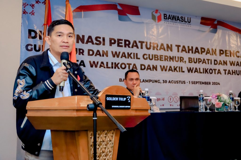 Anggota Bawaslu Provinsi Lampung Gistiawan beri arahan pada kegiatan Diseminasi Peraturan Tahapan Pencalonan Gubernur Dan Wakil Gubernur, Bupati Dan Wakil Bupati, Serta Walikota Dan Wakil Walikota Tahun 2024 di Bandar Lampung, Jumat (30/08).