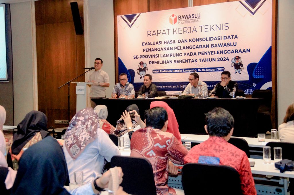 Anggota Bawaslu Provinsi Lampung, Tamri, mengatakan pentingnya evaluasi untuk menentukan arah kebijakan dan strategi yang lebih baik dalam menghadapi pemilu dan Pemilihan di masa depan. hal itu ia ungkapkan saat mengawali kegiatan Rapat Kerja Teknis Evaluasi Hasil dan Konsolidasi Data Penanganan Pelanggaran Bawaslu se-Provinsi Lampung pada Penyelenggaraan Pemilihan Serentak Tahun 2024 yang diselenggarakan di Bandar Lampung, Kamis (16/01).