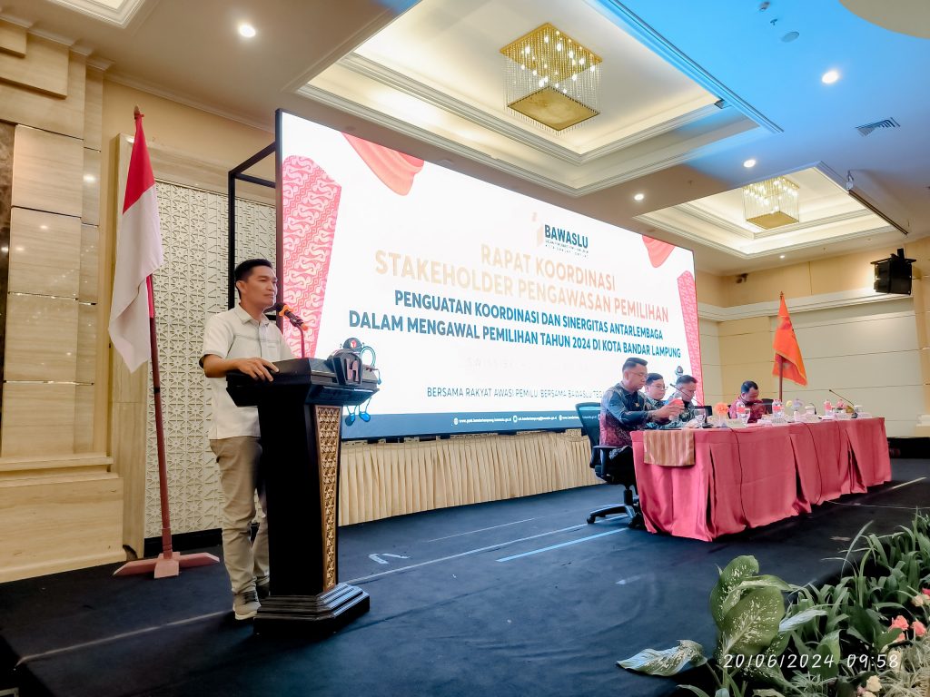 Bawaslu Kota Bandar Lampung mengadakan Rapat Koordinasi Stakeholders Pengawasan Pemilihan bertajuk Penguatan Koordinasi dan Sinegritas Antarlembaga Dalam Mengawal Pemilihan Tahun 2024 di Kota Bandar Lampung, Kamis (20/6).
