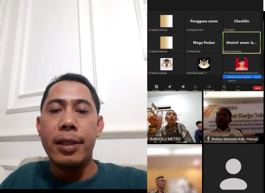Bawaslu Provinsi Lampung bersama Bawaslu Kabupaten/Kota se-Provinsi Lampung menggelar rapat koordinasi secara virtual melalui platform Zoom Meeting pada Minggu, (15/09). Koordinasi ini digelar mempersiapkan sosialisasi netralitas kepala desa menjelang Pemilihan Serentak 2024.