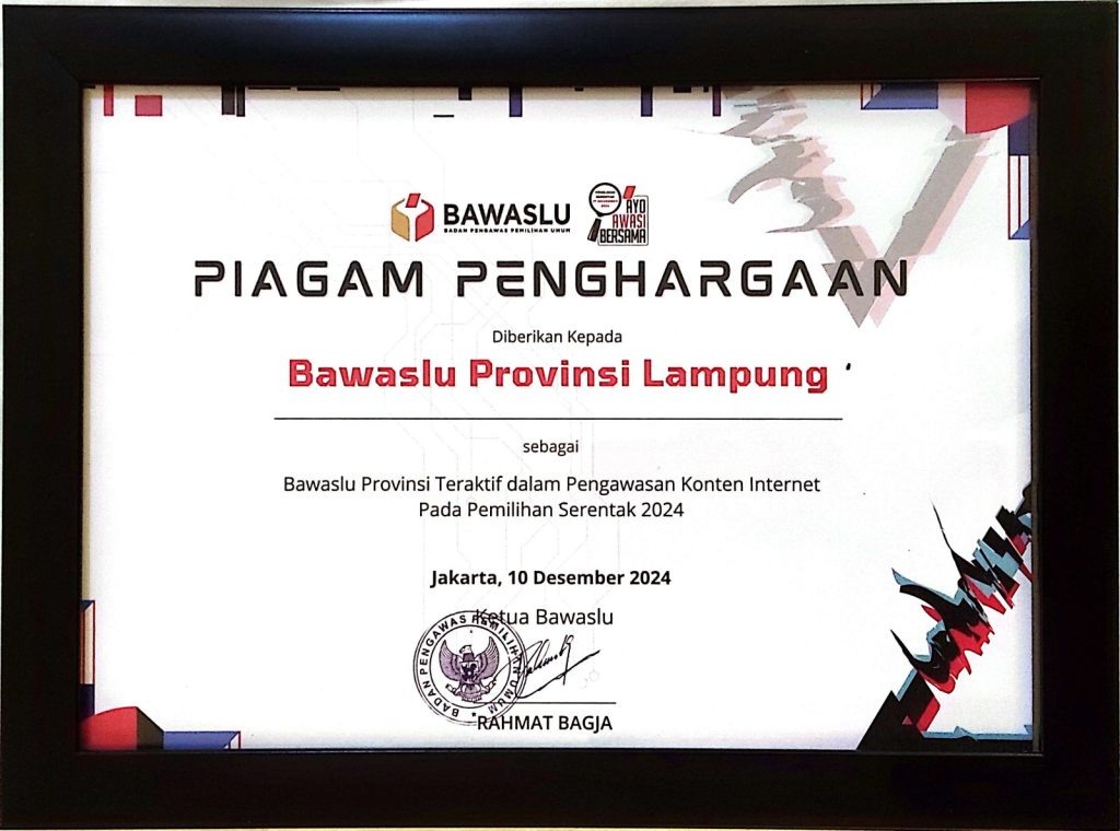 Bawaslu Provinsi Lampung Raih Penghargaan Sebagai Bawaslu Provinsi Teraktif Pengawasan Konten Internet Pada Pemilihan Serentak Tahun 2024