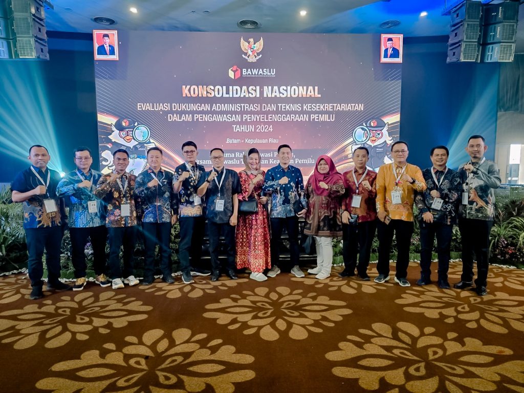 Ketua dan Anggota Bawaslu Provinsi Lampung Iskardo P. Panggar, Suheri, Imam Bukhori, Gistiawan, Hamid Badrul Munir, dan Ahmad Qohar beserta Kepala Sekretariat Widodo Wuryanto dan Kepala Bagian Administrasi Dwi Hendro Nugroho hadiri Konsolidasi Nasional Evaluasi Dukungan Administrasi dan Teknis Kesekretariatan dalam Pengawasan Penyelenggaraan Pemilu 2024 di Batam, Rabu (24/7)
