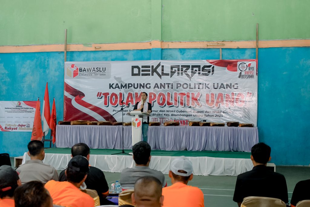 Anggota Bawaslu Lampung Hamid Badrul Munir membuka Deklarasi Kampung Anti Politik Uang. Kegiatan Deklarasi Kampung Anti Politik Uang tersebut berlangsung di Balai Kampung Umpu Bakhti Kecamatan Blambangan Umpu Kabupaten Way Kanan, Sabtu (26/10/2024).