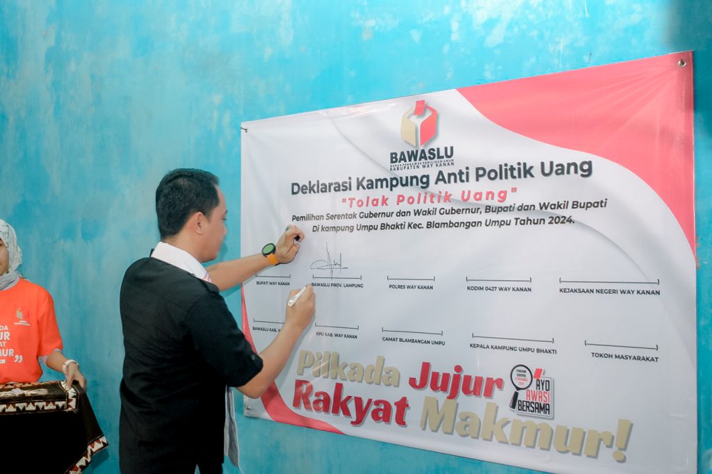 Badan Pengawas Pemilu (Bawaslu) Kabupaten Way Kanan, menggelar Deklarasi Kampung Anti Politik Uang. Kegiatan Deklarasi Kampung Anti Politik Uang tersebut berlangsung di Balai Kampung Umpu Bakhti Kecamatan Blambangan Umpu Kabupaten Way Kanan, Sabtu (26/10/2024).
