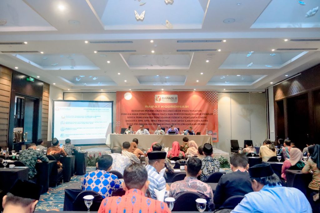 Badan Pengawas Pemilu (Bawaslu) Provinsi Lampung mengadakan rapat koordinasi (Rakor) kesiapan penanganan pelanggaran pada tahapan pengawasan pemutakhiran data dan penyusunan daftar pemilih serta pengawasan pencalonan peserta pemilihan umum anggota DPR, DPD, DPRD Provinsi, Dan DPRD Kabupaten/Kota pada pelaksanaan pengawasan penyelenggaraan pemilu tahun 2024 Di Hotel Sherato, Kamis (22/06)