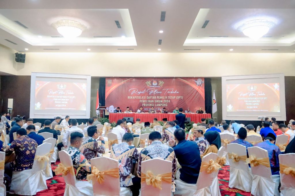 KPU Lampung menggelar rapat pleno terbuka rekapitulasi daftar pemilih tetap (DPT) pemilu 2024 provinsi lampung, di Hotel Emersia Bandar Lampung, Selasa (27/06).