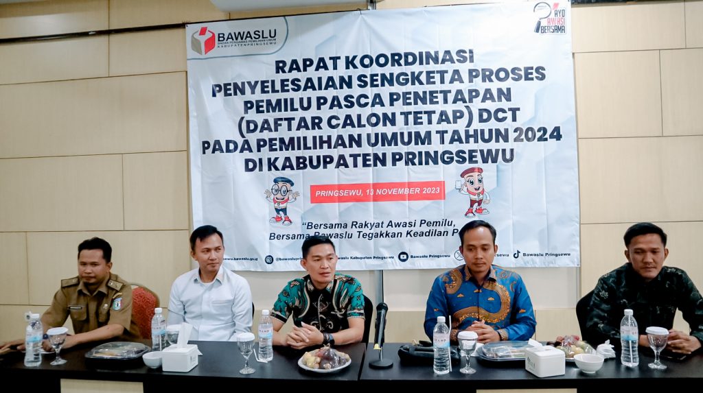 Anggota Bawaslu Lampung Gistiawan, menerangkan Penanganan Pelanggaran dan Penyelesaian Sengketa merupakan esensi marwah dari Bawaslu. Ia menekankan bahwa marwah Bawaslu terletak pada kemampuan dalam menangani pelanggaran dan sengketa yang terjadi dalam konteks pemilihan umum. hal itu iya ungkapkan saat membuka kegiatan Rapat Koordinasi Penyelesaian Sengketa Proses Pemilu Pasca Penetapan Daftar Calon Tetap (DCT) Pada Pemilihan Umum Tahun 2024 Di Kabupaten Pringsewu, Senin (13/11).
