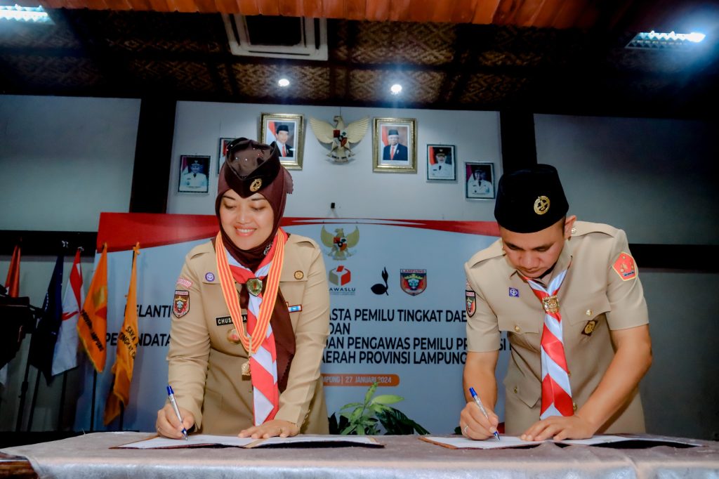 Dalam kesempatan itu Pula Bawaslu Bawaslu melakukan penandatanganan nota kesepahaman Memorandum Of Understanding (MoU) dengan Kwartir Daerah (Kwarda) Gerakan Pramuka Lampung tentang penyelenggaraan pengawasan partisipatif serta pengembangan Saka Adhyasta Pemilu dalam penyelenggaraan pemilu dan pemilihan serentak tahun 2024 di Provinsi Lampung.