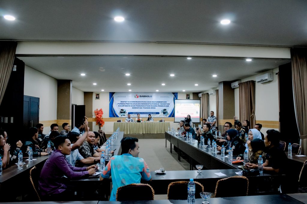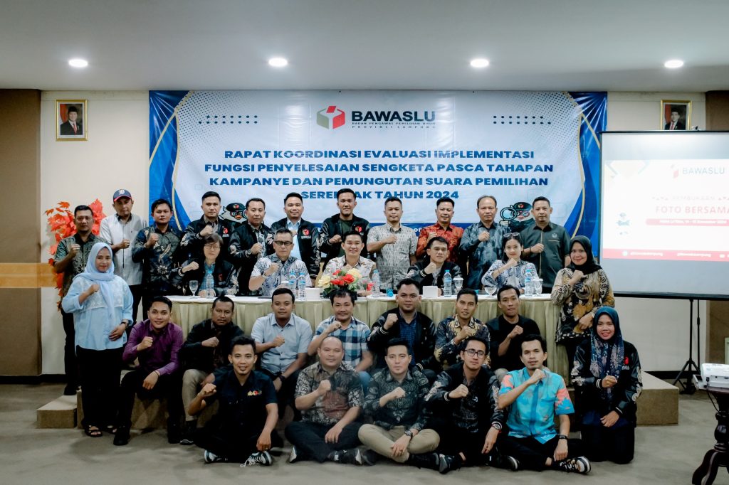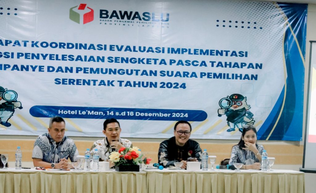 Badan Pengawas Pemilihan Umum (Bawaslu) Provinsi Lampung menggelar Rapat Koordinasi Evaluasi Implementasi Fungsi Penyelesaian Sengketa Pasca Tahapan Kampanye dan Pemungutan Suara Pemilihan Serentak Tahun 2024, sabtu (14/12).