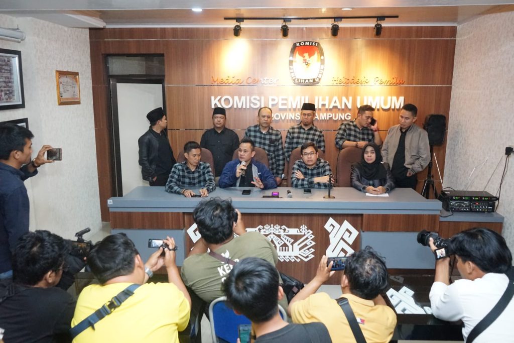 Ketua dan Anggota Bawaslu Provinsi Lampung beserta Ketua dan Anggota KPU Provinsi Lampung sedang memberikan keterangan pada Konfrensi Pers terkait hari terakhir pengajuan bakal calon anggota DPRD Provinsi Lampung di Aula Kantor KPU Lampung (14/05).