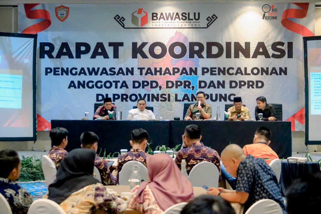 Guna optimalisasi pengawasan tahapan pencalonan anggota DPD, anggota DPR, dan DPRD Provinsi Lampung, Bawaslu Lampung menggelar kegiatan rapat koordinasi pengawasan pencalonan bacaleg, bersama Bawaslu dan KPU Kabupaten/Kota Se-Provinsi Lampung.