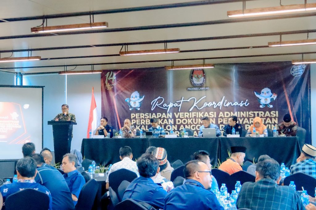 Untuk menyamakan persepsi serta memberikan pemahaman regulasi tentang verifikasi administrasi perbaikan dokumen persyaratan bakal calon legislatif KPU Lampung menggelar Rapat Koordinasi Persiapan Verifikasi Administrasi Perbaikan Dokumen Persyaratan Bakal Calon Anggota DPD, DPRD Provinsi Lampung dan DPRD Kabupaten/Kota, Selasa (04/07)