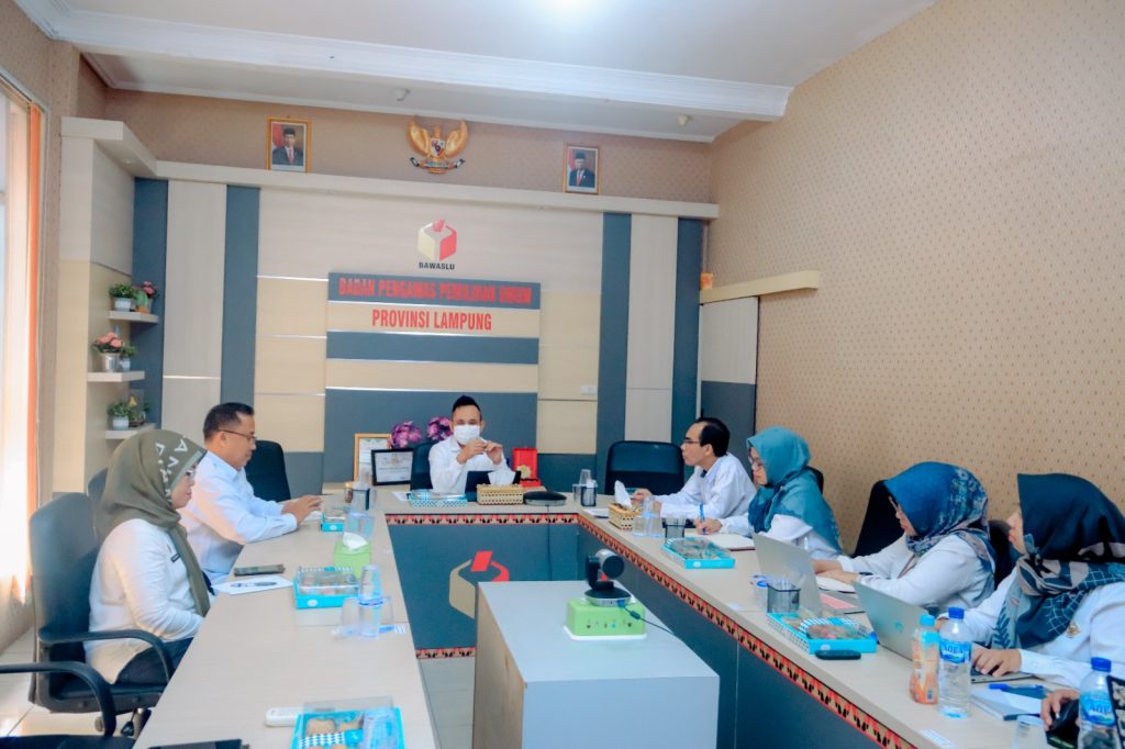 Ketua dan Anggota berserta Kepala Sekretariat Bawaslu Lampung, Iskardo P. Panggar, Imam Bukhori dan Widodo Wuryanto terima kunjungan Badan Pemeriksa Keuangan Perwakilan Lampung di Ruang Rapat Sai Batin, Rabu (02/08).