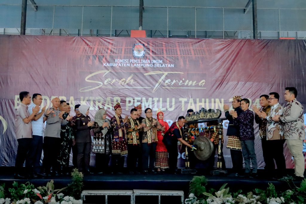 Secara simbolis Kirab Pemilu dilakukan dengan menyerahkan estafet bendera dari KPU Pesawaran kepada KPU Lampung Selatan yang dihelat di GOR Way Handak, Kalianda, Lampung Selatan (13/10).