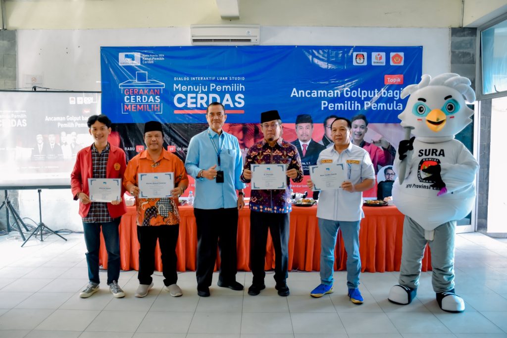 Presiden BEM UTB Lampung Khoirul Anwar, Anggota Bawaslu Provinsi Lampung Karno Ahmad Satarya, Kepala LPP RRI Bandar Lampung Zahral Mutzaini, Anggota KPU Provinsi Lampung Warsito, dan Wakil Rektor III UTB Lampung Riza Yudha Patria foto bersama sesuai acara Dialog Interaktif Menuju Pemilih Cerdas dengan topik Ancaman Golput Bagi Pemilih Pemula yang diselenggarakan oleh RRI di Aula Universitas Tulang Bawang, Rabu (14/06)