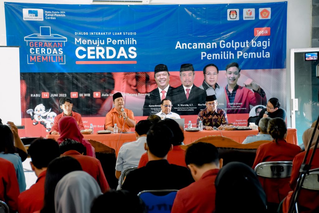 Urgensi Pengawasan Pemilu Tahun 2024 Di Provinsi Lampung, Materi tersebut disampaikan oleh Anggota Bawaslu Lampung Karno Ahmad Satarya pada saat menjadi narasumber dalam acara Dialog Interaktif Menuju Pemilih Cerdas dengan topik Ancaman Golput Bagi Pemilih Pemula yang diselenggarakan oleh RRI di Aula Universitas Tulang Bawang, Rabu (14/06).