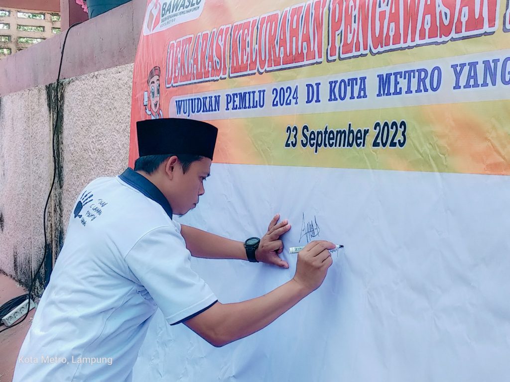 Kordiv SDMO Bawaslu Provinsi Lampung, Imam Bukhori, M. Teguh (Tokoh Masyarakat), serta unsur StakeHolders dan perwakilan masyarakat Kelurahan Tejosari hadiri Deklarasi Kelurahan Pengawasan Partisipatif, bertempat di Stadion Olahraga Tejosari, Kelurahan Tejosari, Kecamatan Metro Timur, Sabtu 23 September 2023.